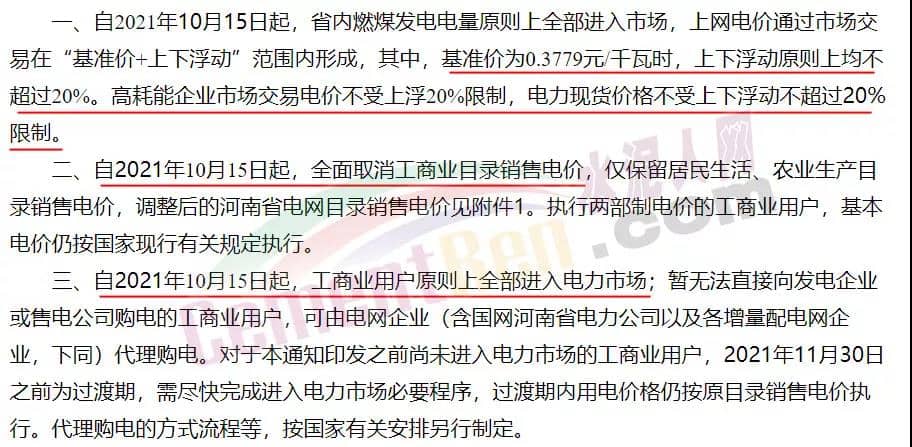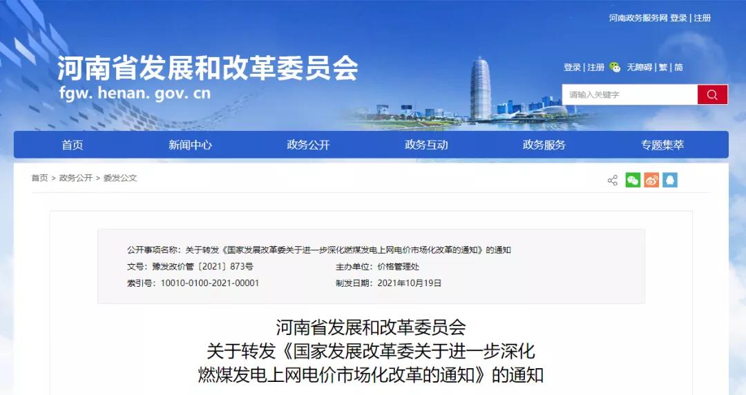河南省內(nèi)燃煤發(fā)電電量原則上全部進(jìn)入市場,上網(wǎng)電價(jià)通過市場交易在“基準(zhǔn)價(jià)+上下浮動(dòng)”范圍內(nèi)形成,其中,基準(zhǔn)價(jià)為0.3779元/千瓦時(shí),上下浮動(dòng)原則上均不超過20%。高耗能企業(yè)市場交易電價(jià)不受上浮20%限制,電力現(xiàn)貨價(jià)格不受上下浮動(dòng)不超過20%限制。自2021年10月15日起,全面取消工商業(yè)目錄銷售電價(jià),僅保留居民生活、農(nóng)業(yè)生產(chǎn)目錄銷售電價(jià)。自2021年10月15日起,工商業(yè)用戶原則上全部進(jìn)入電力市場。
