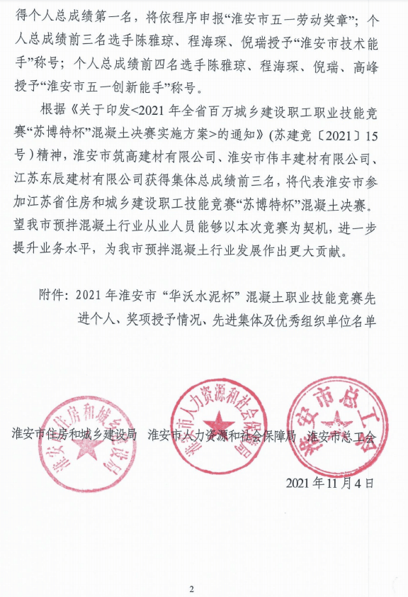日前,?2021年淮安市“華沃水泥杯”混凝土職業(yè)技能競(jìng)賽已圓滿完成各項(xiàng)工作,共有16家預(yù)拌混凝土生產(chǎn)企業(yè)的48名選手組隊(duì)參加,涌現(xiàn)出一批理論扎實(shí)、技術(shù)過硬的選手,一批先進(jìn)個(gè)人和先進(jìn)集體脫穎而出。