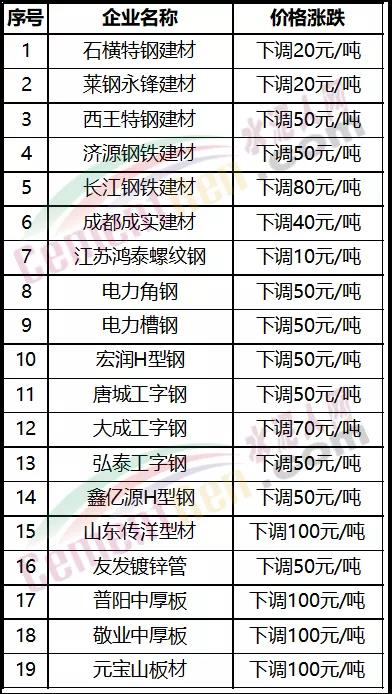 11月9日近20家鋼廠調(diào)價,其中下跌最大為山東傳洋型材,一次性下調(diào)報價100元/噸,具體調(diào)價明細如下: