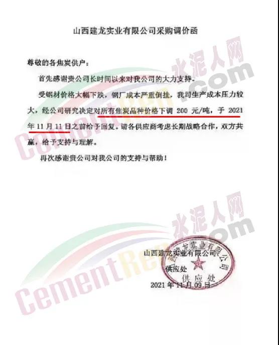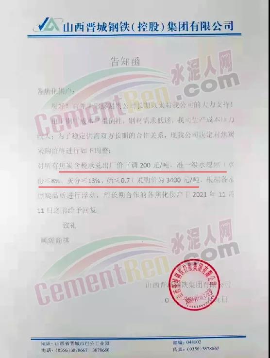 山西晉城鋼鐵控股集團有限公司告知函稱,由于鋼材成本嚴(yán)重倒掛,鋼材需求低迷,企業(yè)生產(chǎn)成本壓力較大。為了穩(wěn)定供需雙方長期的合作關(guān)系,企業(yè)決定對焦炭采購價格進行調(diào)整。對所有焦炭含稅承兌出廠價下調(diào)200元/噸。