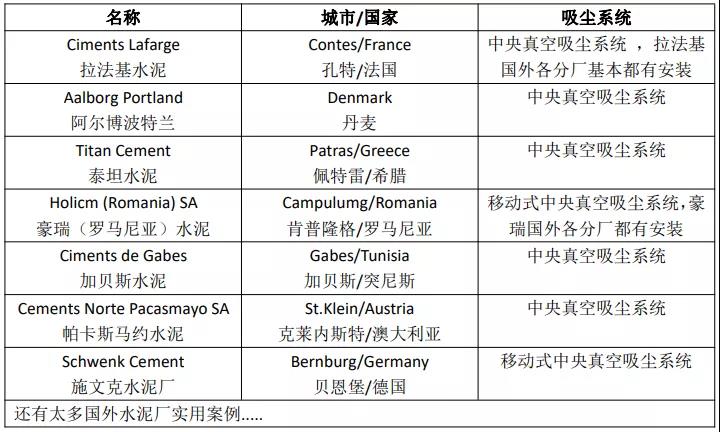 據(jù)水泥人網(wǎng)了解,在世界范圍內(nèi),目前最有效、最高效的粉塵清潔方式,采用純吸的方式(純吸無揚(yáng)塵,無二次污染),可高效快速的吸走粉塵,一次徹底清掃,杜絕二次污染,一套系統(tǒng)可抵多套普通吸塵器,可降低企業(yè)生產(chǎn)成本,提高生產(chǎn)效率,減少人力物力,實(shí)現(xiàn)清潔生產(chǎn)。該套系統(tǒng)在國外水泥廠各車間都是標(biāo)配設(shè)備,為此小編特意查閱了世界水泥工廠使用案例,真是不勝枚舉,在此先簡單羅列幾個。