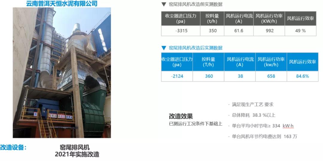 該項目于2021年實施改造,生料磨循環(huán)風機改造后同比運行功率下降937kW。