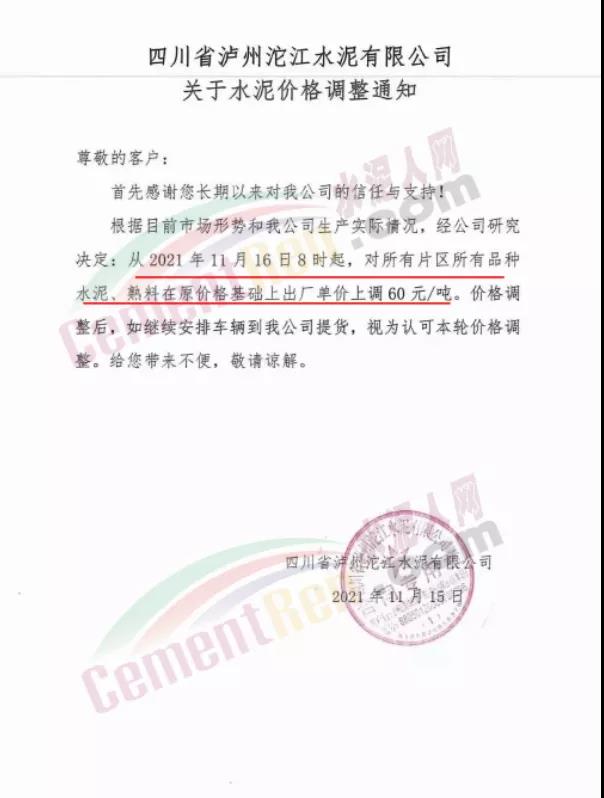 四川省瀘州沱江水泥有限公司通知根據(jù)目前市場形勢和公司生產(chǎn)實際情況,經(jīng)公司研究決定從2021年11月16日8時起,對所有片區(qū)所有品種水泥、熟料在原價格基礎上出廠單價上調60元/噸。
