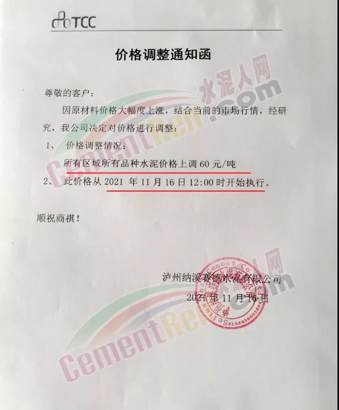 瀘州蘭良水泥有限公司通知,自11月17日起,各品種袋裝、散裝水泥價格統(tǒng)一上調60元/噸。