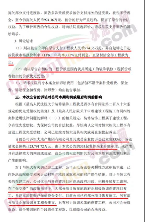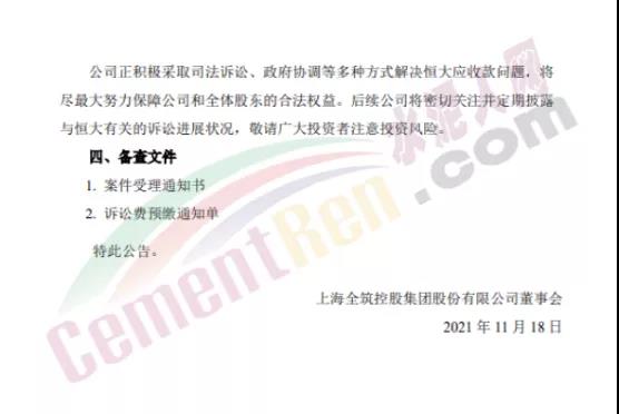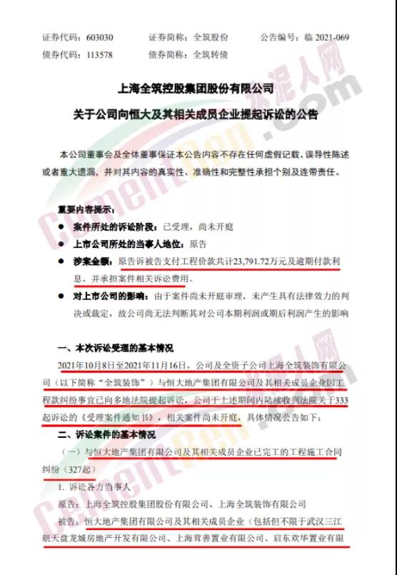 11月17日晚間,全筑股份公告稱,公司及全資子公司全筑裝飾與恒大地產(chǎn)集團及其相關(guān)成員企業(yè)因工程款糾紛事宜已向多地法院提起訴訟。全筑股份訴恒大方面支付工程價款共計2.38億元及逾期付款利息,并承擔案件相關(guān)訴訟費用。全筑股份表示,正積極采取司法訴訟、政府協(xié)調(diào)等多種方式解決恒大應收款問題。