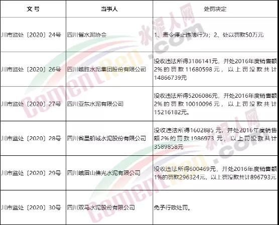 四川省市場監(jiān)督管理局發(fā)布6條《行政處罰決定書》。其中針對于當?shù)厮嘈袠I(yè)的處罰決定書提到案件來源及調(diào)查經(jīng)過為:2017年7月,四川省發(fā)展和改革委員會從多個途徑收到反映四川省水泥協(xié)會組織本行業(yè)經(jīng)營者聯(lián)合漲價的舉報。經(jīng)初步核查后,四川省發(fā)展和改革委員會于2017年7月20日正式對四川省水泥協(xié)會及涉嫌達成并實施壟斷協(xié)議的六家水泥經(jīng)營者予以立案調(diào)查,總計處罰3506.9572萬元。