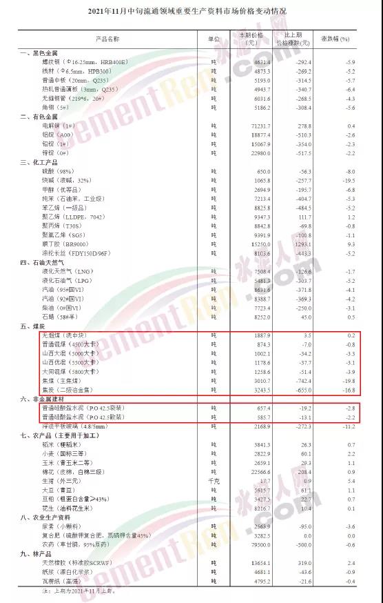 日前,國家統(tǒng)計(jì)局發(fā)布《2021年11月中旬流通領(lǐng)域重要生產(chǎn)資料市場價(jià)格變動(dòng)情況,據(jù)對(duì)全國流通領(lǐng)域9大類50種重要生產(chǎn)資料市場價(jià)格的監(jiān)測顯示,2021年11月中旬與11月上旬相比,14種產(chǎn)品價(jià)格上漲,35種下降,1種持平。其中,普通硅酸鹽水泥(P.O42.5散裝)均價(jià)585.7元/噸,較十一月上旬下跌13.1元/噸;普通硅酸鹽水泥(P.O42.5袋裝)報(bào)價(jià)657.4元,較上旬下跌19.2元/噸。