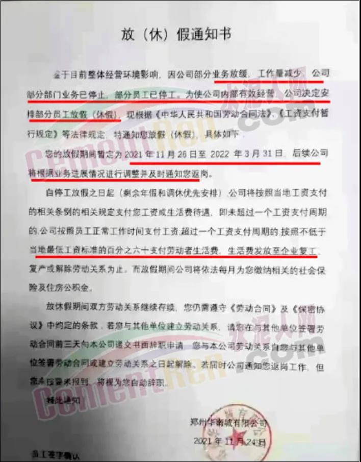 11月24日,河南鄭州華南城發(fā)出放假通知稱(chēng),鑒于目前整體經(jīng)營(yíng)環(huán)境影響,因公司部分業(yè)務(wù)放緩,工作量減少,公司部分部門(mén)業(yè)務(wù)已停止,部分員工已停工。為使公司內(nèi)部有效經(jīng)營(yíng),公司決定安排部分員工放假(休假):2021年11月26日至2022年3月31日,共計(jì)4個(gè)多月。休假期間,公司將支付不低于本地最低工資60%作為勞動(dòng)者生活費(fèi),社保和公積金正常繳納。