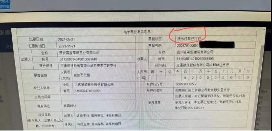 某粉絲爆料稱:手中持有的一張20萬商票,本該于11月21日兌付,但截至目前票據(jù)狀態(tài)卻顯示已拒付。從票據(jù)中能夠看出,該筆商票出票人為西安嘉寶摩碼置業(yè)有限公司,而承兌人信息欄則顯示為當代節(jié)能置業(yè)股份有限公司。