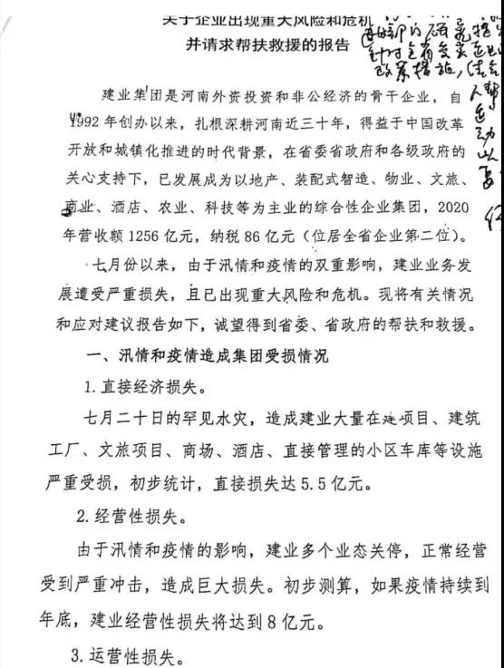 不久前,一封有關(guān)河南王建業(yè)的求助信在網(wǎng)絡(luò)上流傳。這封題為《關(guān)于企業(yè)出現(xiàn)重大風險和危機并請求幫扶救援的報告》的“求助信”稱:如果建業(yè)被汛情疫情拖累,過不去眼前這個坎,有可能成為全國企業(yè)“爆雷”和倒下的“下一個”,其消極反響將是全國性的、極為嚴重的。因為這封信,“建業(yè)系”四家上市公司(建業(yè)地產(chǎn)、筑友智造科技、中原建業(yè)、建業(yè)新生活)股價齊齊下跌。為此,建業(yè)集團迅速召開線上媒體溝通會,總裁王俊出面回應(yīng)稱,“求助信”內(nèi)容真實。