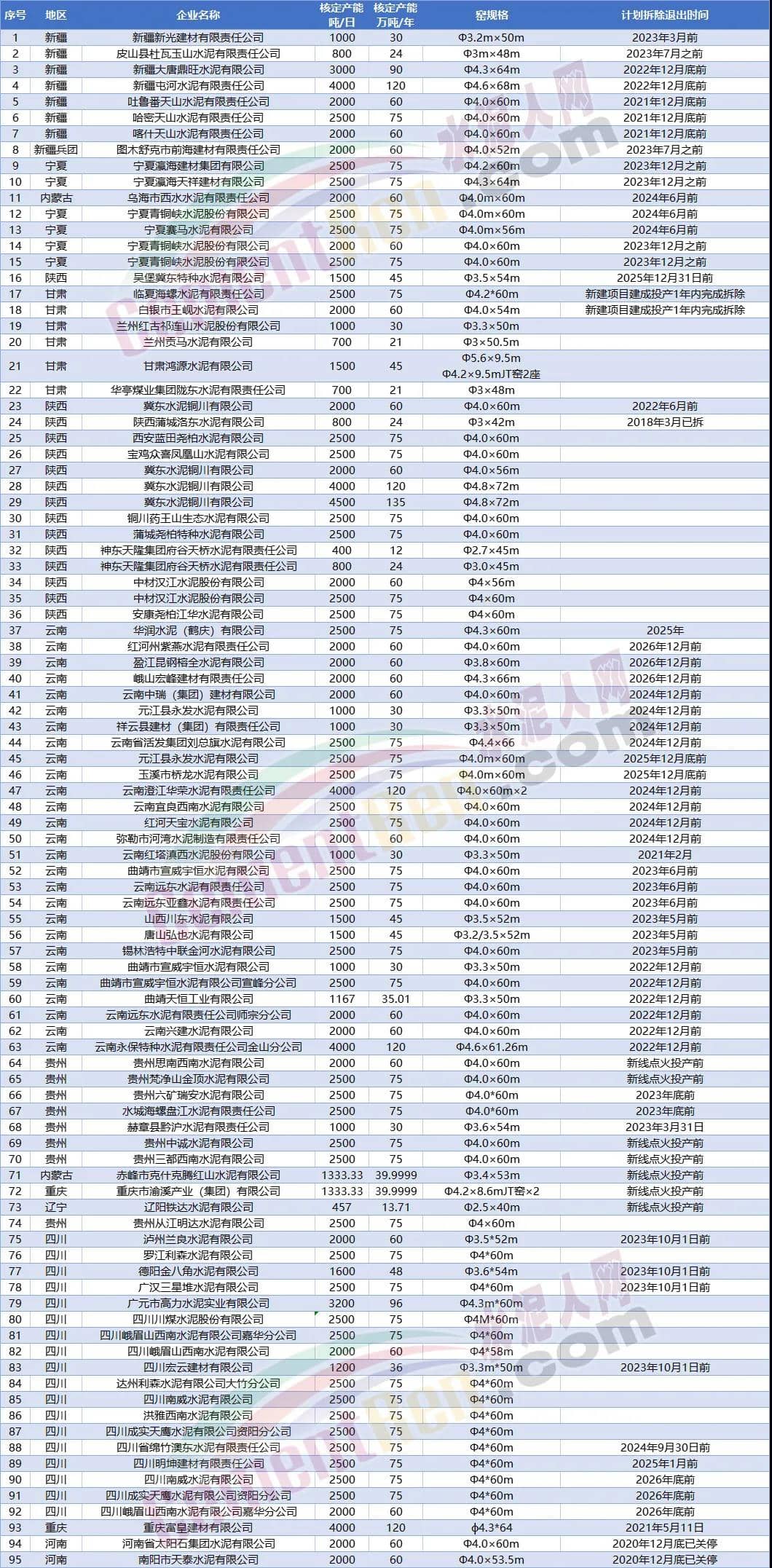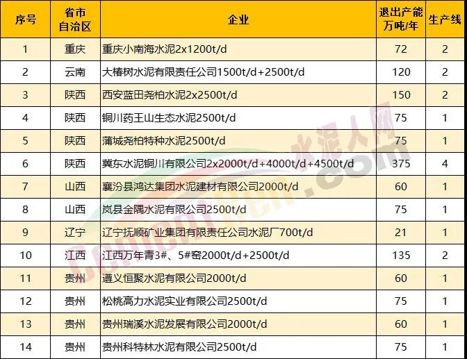 另據(jù)水泥人網(wǎng)不完全統(tǒng)計今年以來已經(jīng)有20多條水泥熟料生產(chǎn)線發(fā)布關(guān)停拆除消息。涉及陜西 、貴州、山西、江西、云南、重慶、遼寧7個省市自治區(qū)合計14個項目21條生產(chǎn)線。退出產(chǎn)能合計1428萬噸/年。其中包括冀東水泥銅川有限公司4條熟料生產(chǎn)線,退出產(chǎn)能達(dá)375萬噸/年,以及重慶小南海水泥72萬噸/年熟料產(chǎn)能。
