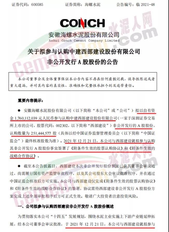 海螺水泥公告稱,為貫徹落實本公司“十四五”發(fā)展規(guī)劃,圍繞水泥主業(yè)實施上下游產(chǎn)業(yè)鏈延伸拓展,經(jīng)本公司董事會審議批準,于2021年12月21日,本公司與西部建設(shè)就擬參與認購其非公開發(fā)行股份事宜簽署了《附條件生效的股票認購協(xié)議》和《附條件生效的戰(zhàn)略合作協(xié)議》。西部建設(shè)是國內(nèi)領(lǐng)先的建材產(chǎn)業(yè)綜合服務商,也是國內(nèi)商品混凝土行業(yè)的領(lǐng)軍企業(yè),本公司擬通過認購其非公開發(fā)行A股股份的方式,進一步加強雙方在原材料供銷、混凝土業(yè)務、砂石骨料業(yè)務、物流運輸、產(chǎn)業(yè)互聯(lián)網(wǎng)等方面的戰(zhàn)略合作。