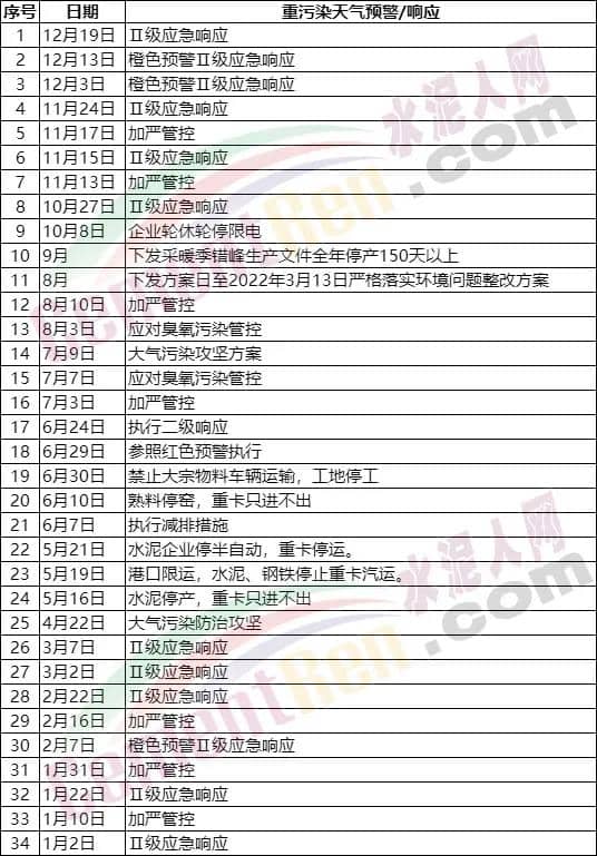 從上述管控措施來看,無論是加嚴管控還是直接發(fā)布橙色預警Ⅱ級應急響應,其管控要求均有關(guān)于水泥熟料、粉磨、商砼企業(yè)停限產(chǎn),重卡物流限運或只進不出,下游工地停工等。