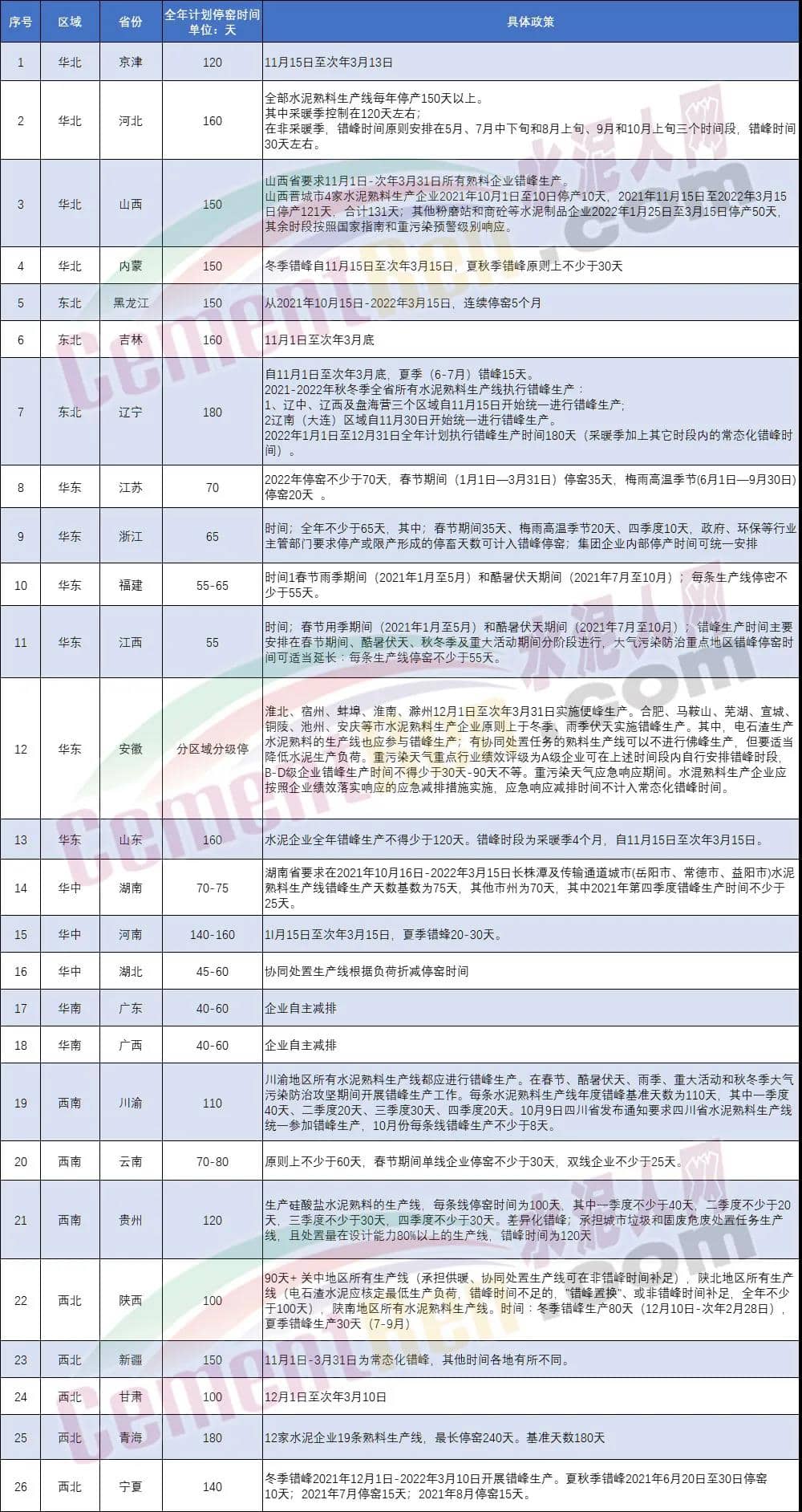 另據(jù)水泥人網(wǎng)近期消息,各區(qū)域水泥行業(yè)2022年錯峰生產(chǎn)計劃出臺,2022年最長停產(chǎn)區(qū)域達180天。河北金隅鼎鑫水泥有限公司2000t/d生產(chǎn)線2022年非采暖季錯峰30天,采暖季錯峰260天,合計停產(chǎn)天數(shù)達290天。