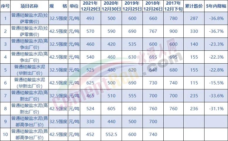 據(jù)查詢,自2017年12月以來,西藏拉薩區(qū)域水泥價格出現(xiàn)持續(xù)下跌,5年內(nèi)降幅15.5~36.8%。其中42.5標(biāo)號普通硅酸鹽水泥(拉薩零售價)從2017年12月份的900元/噸,跌至2021年12月29日的570元/噸,累計跌價達(dá)330元/噸,跌幅36.7%。
