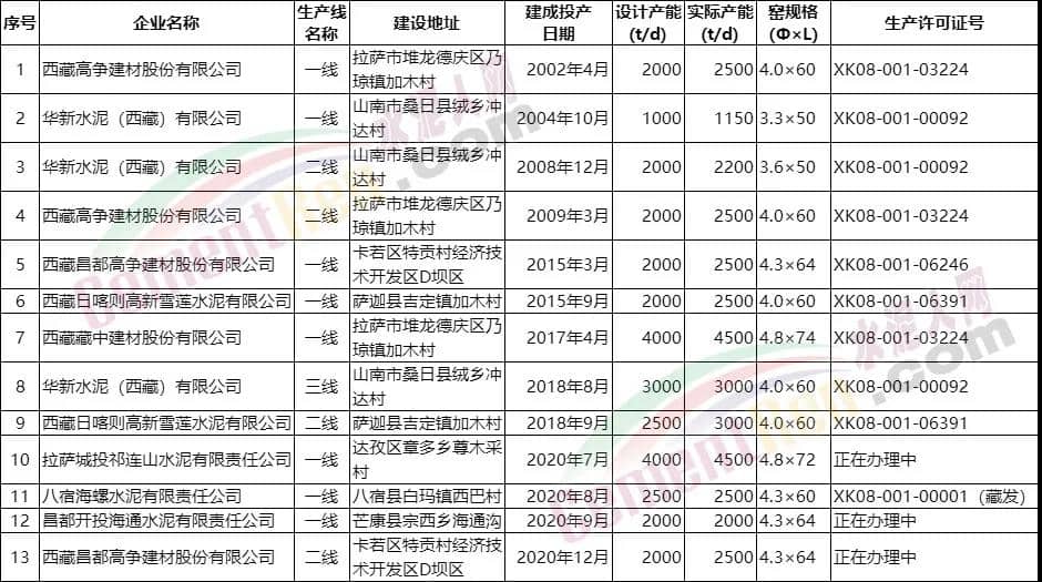 據(jù)西藏工信廳發(fā)布截止2021年3月25日的水泥熟料生產(chǎn)線清單顯示,自2017年4月以來投產(chǎn)的生產(chǎn)線共7條,2020年投產(chǎn)生產(chǎn)線為拉薩城投祁連山水泥4000t/d、八宿海螺一線2500t/d、昌都開投海通水泥一線2000t/d、西藏昌都高爭建材二線2000t/d等。