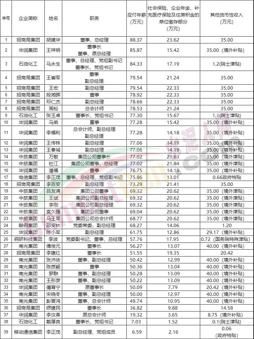 各企業(yè)集團(tuán)董事長(zhǎng)、副董事長(zhǎng)薪酬一覽