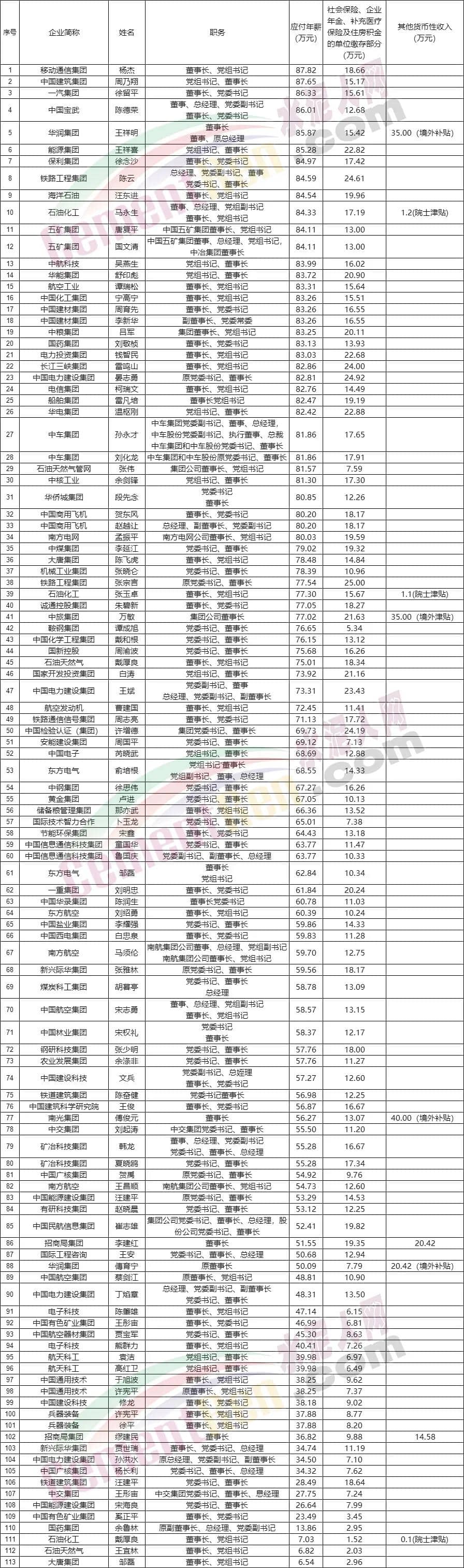 據(jù)水泥人網(wǎng)不完全統(tǒng)計(jì)國(guó)資委本次公布的860位負(fù)責(zé)人應(yīng)付薪酬平均值為57.98萬(wàn),社會(huì)保險(xiǎn)、企業(yè)年金、補(bǔ)充醫(yī)療保險(xiǎn)及住房積金的單位繳存部分平均值為17.60萬(wàn)元。其中享受?chē)?guó)務(wù)院津貼、院士津貼、境外津貼等其他貨幣性收入的企業(yè)負(fù)責(zé)人39位。