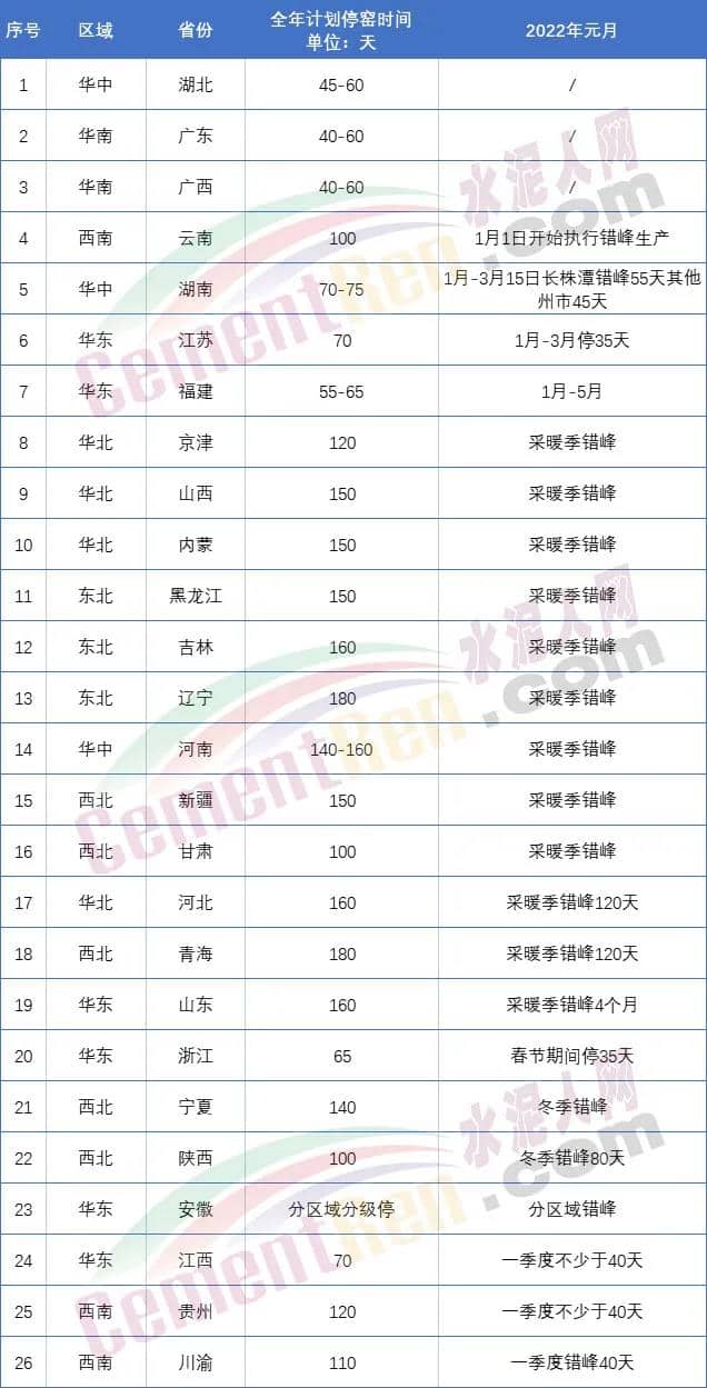 據(jù)水泥人網(wǎng)不完全統(tǒng)計,目前已經(jīng)有26個地區(qū)發(fā)布了2022年錯峰生產(chǎn)計劃,除華中南湖北、廣東、廣西外,其他23個區(qū)域本月內(nèi)均有企業(yè)處于錯峰停產(chǎn)中。
