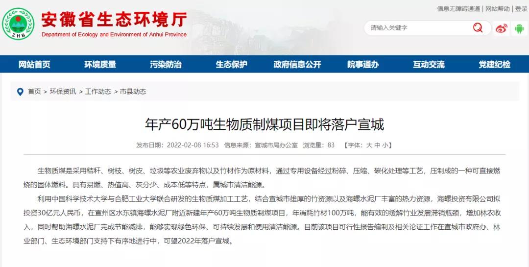 安徽省生態(tài)環(huán)境廳消息:年產60萬噸生物質制煤項目即將落戶宣城。其中提到,海螺投資有限公司擬投資30億元人民幣,在宣州區(qū)海螺水泥廠附近新建年產60萬噸生物質制煤項目,該項目可望2022年落戶宣城。
