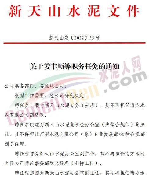 近日,新天山水泥發(fā)布吧《關(guān)于姜豐順等職務(wù)任免的通知》,通知提到,根據(jù)工作需要,經(jīng)新天山水泥研究決定,做出以下任免安排:
