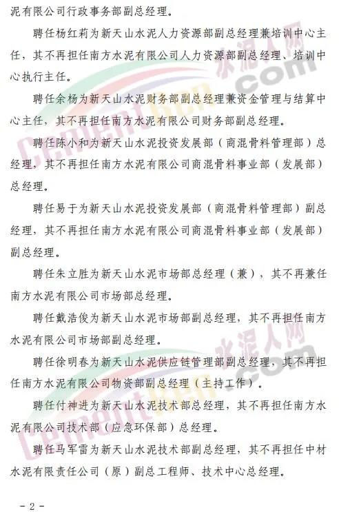 聘任朱立勝為新天山水泥市場(chǎng)部總經(jīng)理(兼),其不再兼任南方水泥有限公司市場(chǎng)部總經(jīng)理。