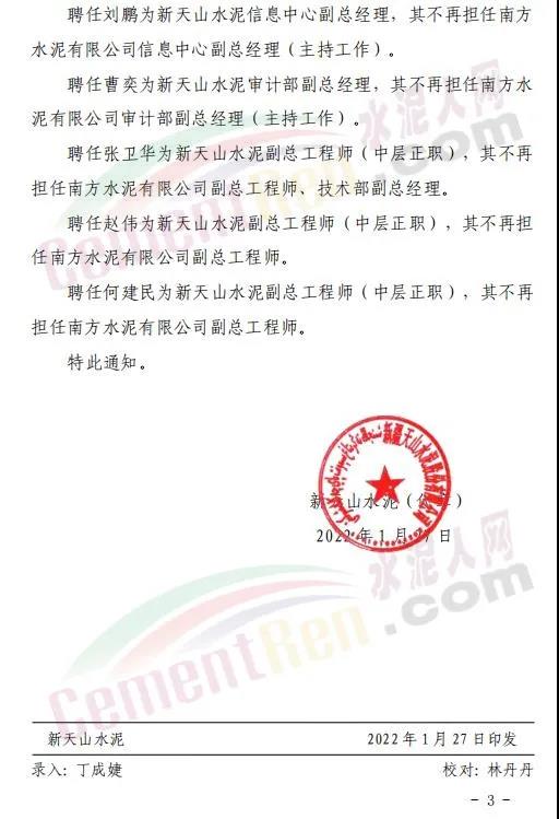 聘任趙偉為新天山水泥副總工程師(中層正職),其不再擔(dān)任南方水泥有限公司副總工程師。