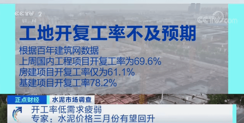 相關(guān)數(shù)據(jù)顯示,上周國內(nèi)工程項目開復(fù)工率為69.6%,同比下降17.3%,其中,房建項目表現(xiàn)不佳,開復(fù)工率僅為61.1%;基建開復(fù)工率78.2%??傮w來看,二月份工地開工不及預(yù)期,導(dǎo)致水泥需求冷淡,抑制了水泥價格。由于下游的勞務(wù)到位,包括上工情況,節(jié)奏還是有點慢。只是從水泥混凝土砂石這個板塊來看,目前這個銷量同比去年下降20%到50%。