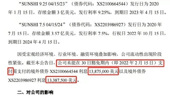 陽光城公告,存續(xù)規(guī)模分別為3億美元和3.57億美元的兩筆美元債未能在30日豁免期內(即2022年2月15日)支付利息,合計約2726萬美元(折合人民幣約1.73億元),構成實質性違約。