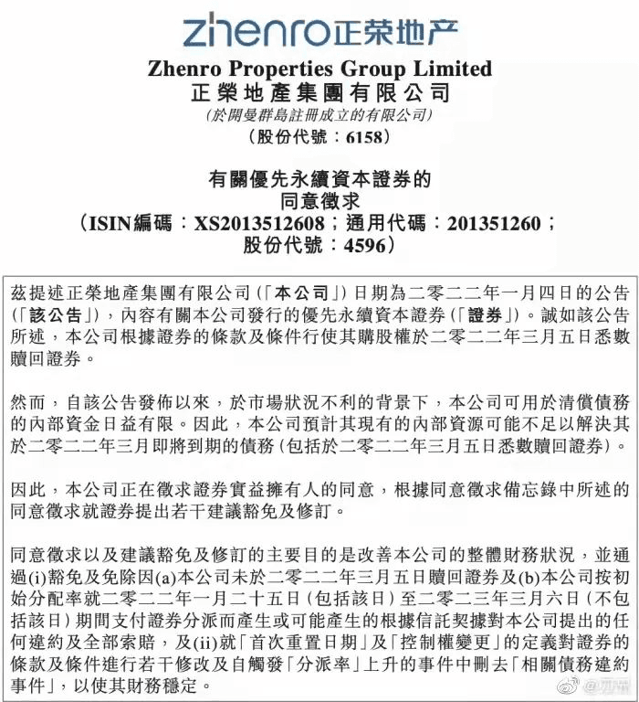正榮地產公告稱,公司資源不足以支付2億美元永續(xù)債,正嘗試征求證券實益擁有人的同意,就證券提出若干建議豁免及修訂。