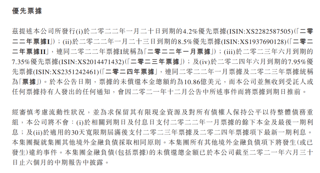 中國奧園宣布,將不會支付即將于2022年1月20日本金總額為1.88億美元及1月23日到期本金總額為5億美元的美元票據支付余下本金及最后一期利息。截至2022年1月20日,奧園未償美元債務總額高達32億美元。
