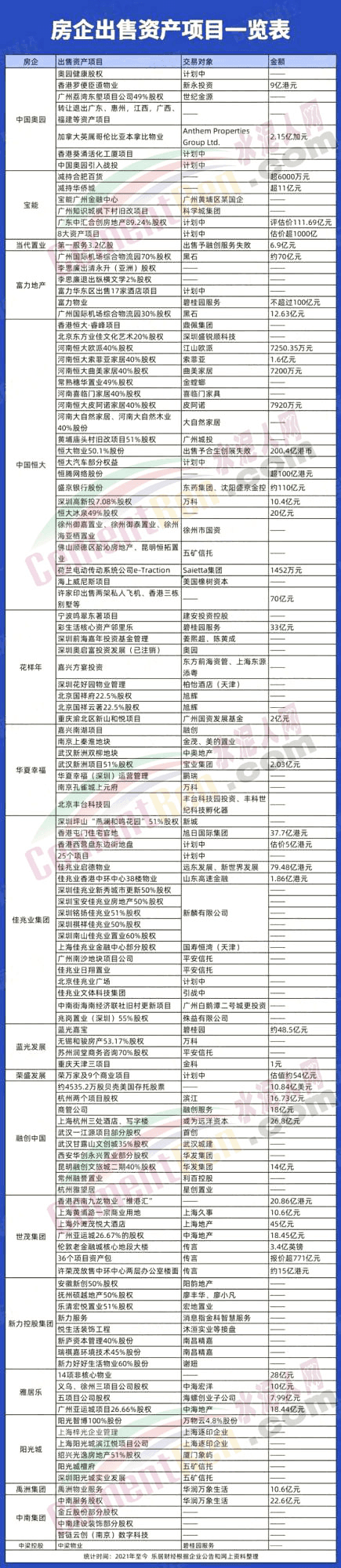 隨著地產調控政策趨緊,多家房地產企業(yè)的資金壓力持續(xù)上升,前有藍光、華夏幸福、泰禾,后有恒大、佳兆業(yè)、奧園,還有的則在暴雷的路上。房企高償債壓力之下,違約風險日益加大,越來越多的放棄開始割肉賣身。恒大、融創(chuàng)、世茂、中南、禹洲、奧園、雅居樂、花樣年等房企,均已成功將部分資產轉讓出去。