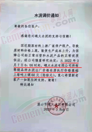 夾江縣峨威水泥有限公司通知,根據(jù)目前市場行情,由于原材料廠家停產(chǎn)限產(chǎn),結(jié)合公司實際情況,經(jīng)研究決定自2022年3月7日0時起,公司生產(chǎn)的所有品牌等級水泥出廠單價在原基礎(chǔ)上上調(diào)60元/噸。