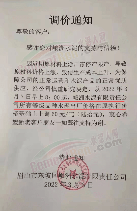 眉山市東坡區(qū)峨洲水泥有限責任公司通知,因近期原材料上游廠家停產(chǎn)限產(chǎn),導(dǎo)致原材料價格上漲,致使生產(chǎn)成本上升,為保障公司的正常運營和水泥產(chǎn)品的正常優(yōu)質(zhì)供應(yīng),經(jīng)公司慎重研究決定,從2022年3月7日早上8時起,峨洲水泥有限責任公司所有等級品種水泥出廠價格在原執(zhí)行價格基礎(chǔ)上上調(diào)60元/噸。