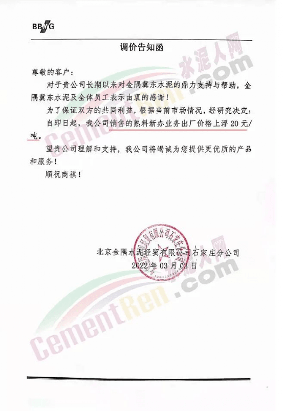 山西太原金隅冀東水泥經(jīng)貿(mào)有限公司通知,自2022年3月2日8時起將大同冀東、廣靈金隅和代縣環(huán)保水泥P.O42.5散出廠價調(diào)整為460元/噸,其他品種水泥在此基礎(chǔ)上對應(yīng)同步上調(diào)價格。