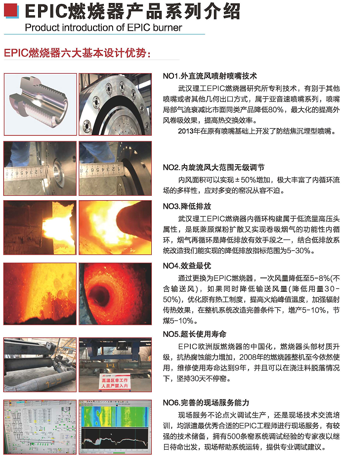 據(jù)了解,武漢祥焱EPIC燃燒器在設(shè)計(jì)之初就考慮低一次風(fēng)使用量及較高的使用動(dòng)能,大刀闊斧進(jìn)行改造設(shè)計(jì)創(chuàng)新,在低氮排放,強(qiáng)化煅燒,抗物流波動(dòng)等諸多生產(chǎn)的實(shí)際需求方面,達(dá)到國際技術(shù)領(lǐng)先優(yōu)勢,是國內(nèi)同行業(yè)中唯一可以執(zhí)行拉法基歐洲壓力測試標(biāo)準(zhǔn)的全球供應(yīng)商。其特有的六大基本優(yōu)勢使得其在同行業(yè)中脫穎而出。