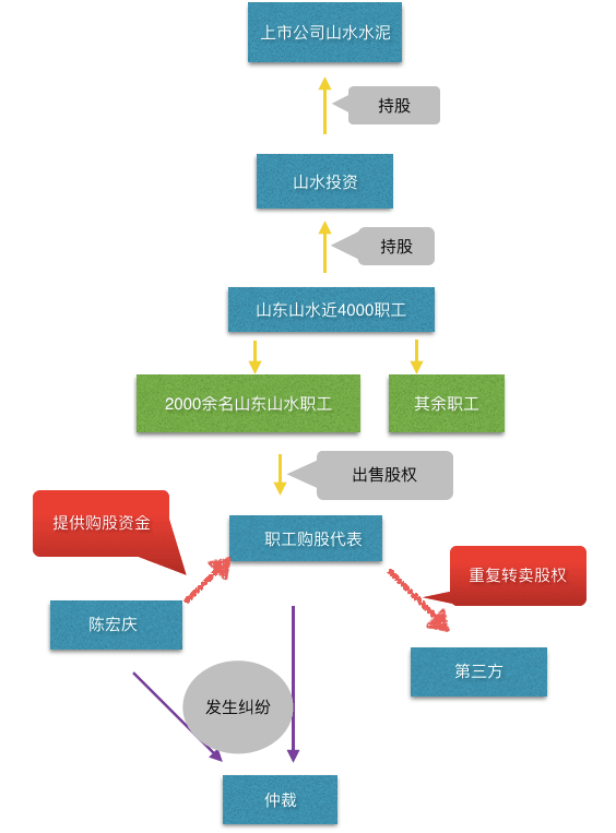 話分兩頭說,2013年,山水水泥高管內(nèi)斗爆發(fā)后。不少高管和職工此后謀求股權變現(xiàn),于是找到了河南汝州商人陳宏慶。2015年,陳宏慶開始收購山水水泥職工股東的持有股權,但他并未直接與職工股東完成交易,而是在部分高管的協(xié)助下,以付元偉、劉德權、郝廣祥等11名職工購股代表的名義收購職工股份。