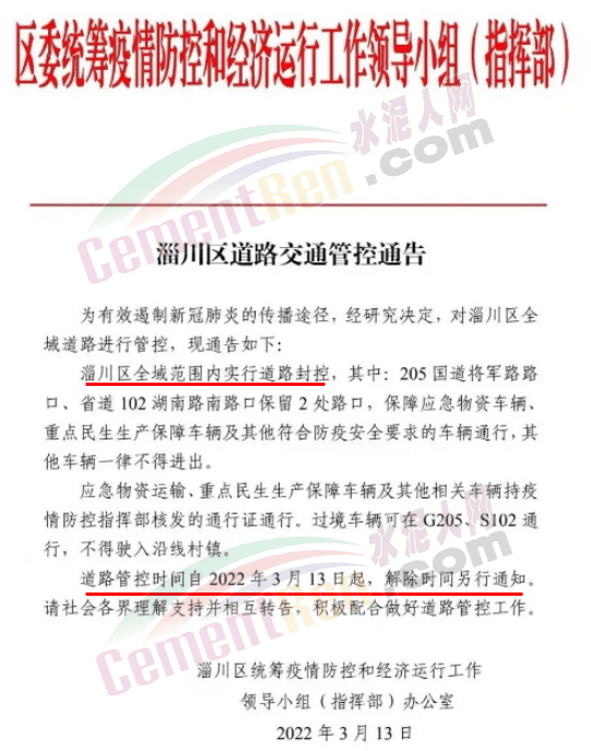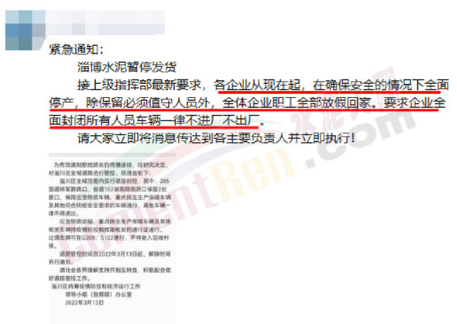 水泥人網(wǎng)通訊員消息,受不可抗力影響,上海部分區(qū)域水泥中轉(zhuǎn)庫(kù)暫停發(fā),預(yù)計(jì)這種情況將持續(xù)2-3天。同日,山東淄博企業(yè)通知稱,接上級(jí)指揮部最新要求,各企業(yè)從現(xiàn)在起,在確保安全的情況下全面停產(chǎn),除保留必須值守人員外,全體企業(yè)職工全部放假回家,要求企業(yè)全面封閉所有人員車輛一律不進(jìn)廠不出廠。