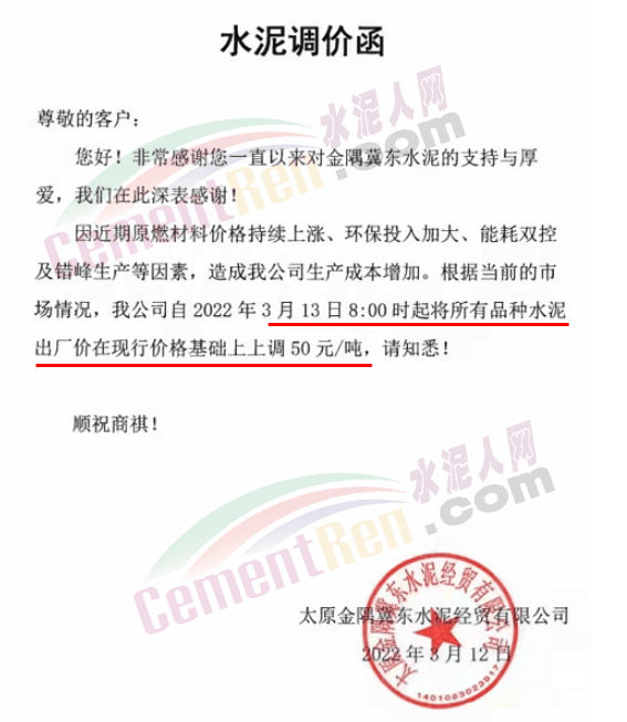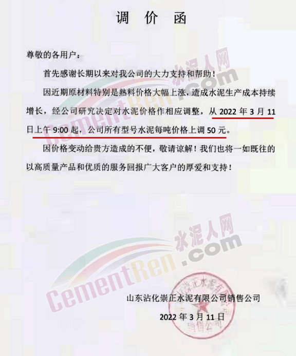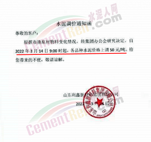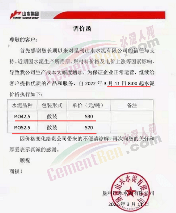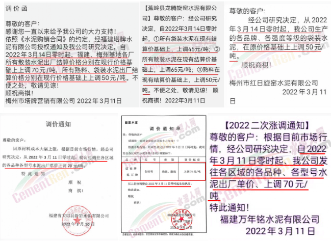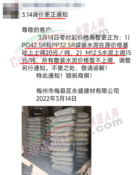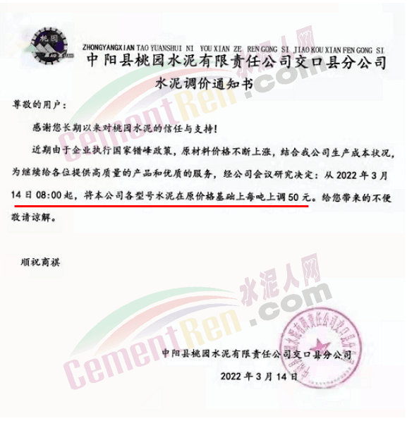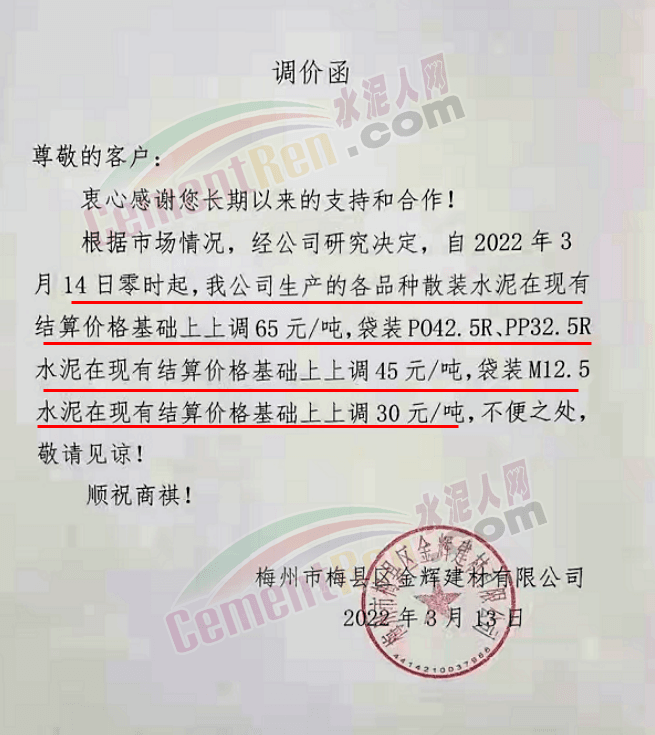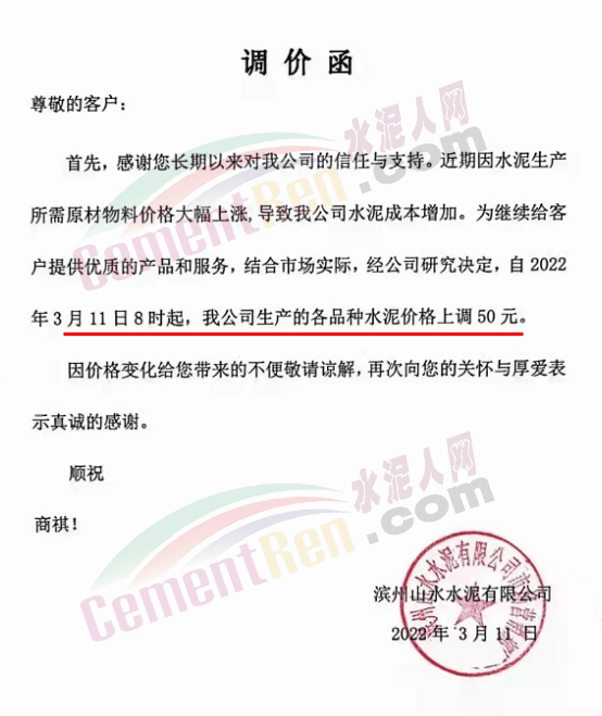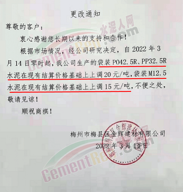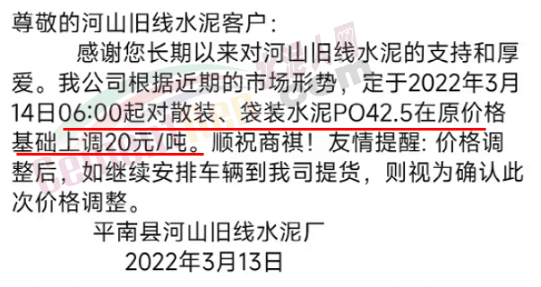 據(jù)了解,該企業(yè)3月13日時(shí)曾通知自2022年3 月14日零時(shí)起,公司生產(chǎn)的各品種散裝水泥在現(xiàn)有結(jié)算價(jià)格基礎(chǔ)上上調(diào)65元/噸,袋裝PO42.5R、PP32.5R 水泥在現(xiàn)有結(jié)算價(jià)格基礎(chǔ)上上調(diào)45元/噸,袋裝M12.5 水泥在現(xiàn)有結(jié)算價(jià)格基礎(chǔ)上上調(diào) 30元/噸。