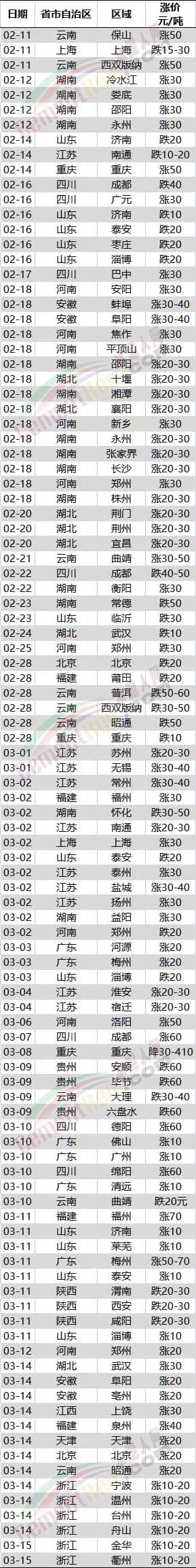 同樣波動(dòng)頻繁的還有山東濟(jì)南跌30元/噸,漲10元/噸;山東泰安跌40元/噸,漲10元/噸;山東淄博跌40元/噸,漲10元/噸;江蘇南通跌10-20元/噸,漲20-30元/噸;河南鄭州漲50元/噸,跌50元/噸;云南曲靖漲30-50元/噸,跌20元/噸;云南西雙版納漲50元/噸,跌30-50元/噸……