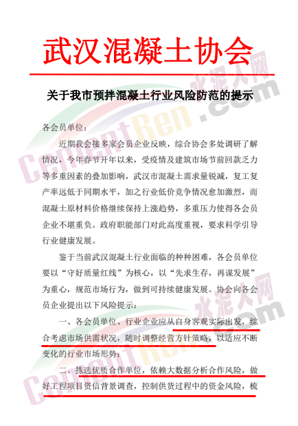 湖北武漢市混凝土協(xié)會(huì)發(fā)文給各會(huì)員單位稱,今年春節(jié)開年以來(lái),受疫情及建筑市場(chǎng)節(jié)前回款乏力等多重因素的疊加影響,武漢市混凝土需求量銳減,復(fù)工復(fù)產(chǎn)率遠(yuǎn)低于同期水平,加之行業(yè)低價(jià)競(jìng)爭(zhēng)情況愈加激烈,而混凝土原材料價(jià)格繼續(xù)保持上漲趨勢(shì),多重壓力使得各會(huì)員企業(yè)不堪重負(fù)。鑒于當(dāng)前武漢混凝土行業(yè)面臨的種種困難,協(xié)會(huì)向各會(huì)員企業(yè)提出以下風(fēng)險(xiǎn)提示,各企業(yè)應(yīng)從自身客觀實(shí)際出發(fā),綜合考慮市場(chǎng)供需狀況,隨時(shí)調(diào)整經(jīng)營(yíng)方針策略,以適應(yīng)不斷變化的行業(yè)市場(chǎng)形勢(shì);揀選優(yōu)質(zhì)合作單位,依賴大數(shù)據(jù)分析合作風(fēng)險(xiǎn),做好工程項(xiàng)目資信背景調(diào)查,控制供貨過程中的資金風(fēng)險(xiǎn),梳理應(yīng)收賬款,多方式解決爭(zhēng)議,降低墊資風(fēng)險(xiǎn);拒絕接受部分企業(yè)的商業(yè)承兌匯票支付方式,降低自身資金風(fēng)險(xiǎn),以免造成連帶訴訟反應(yīng)。