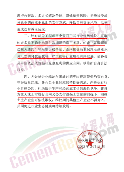 針對(duì)部分工程項(xiàng)目企業(yè)利用其行業(yè)優(yōu)勢(shì)地位,采取約定多重不確定結(jié)算付款期限的霸王條款、約定“寬限期訴訟視為違約”等限制訴權(quán)條款、必須接受商業(yè)保理及商業(yè)承兌匯票的付款條款等,嚴(yán)重?fù)p害行業(yè)規(guī)范有序發(fā)展,請(qǐng)各會(huì)員單位依法依規(guī)簽訂互惠互利的供應(yīng)合同,以維護(hù)自身合法權(quán)益;各會(huì)員企業(yè)間應(yīng)保持良好溝通,嚴(yán)格執(zhí)行行業(yè)自律公約,杜絕低于生產(chǎn)和經(jīng)營(yíng)成本價(jià)的惡性競(jìng)爭(zhēng),建設(shè)方在無(wú)法正常履行合同義務(wù)支付混凝土貨款的前提下,混凝土生產(chǎn)企業(yè)可依法維權(quán),維權(quán)期間其他生產(chǎn)企業(yè)不得介入。