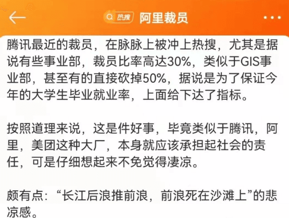 據(jù)水泥人網(wǎng)了解,近期阿里裁員、騰訊裁員迅速登錄熱門榜,騰訊預計裁員10~30%。而阿里旗下MMC事業(yè)群正計劃裁員,本次裁員數(shù)量約20%……現(xiàn)在的就業(yè)環(huán)境更是讓人后背發(fā)涼。