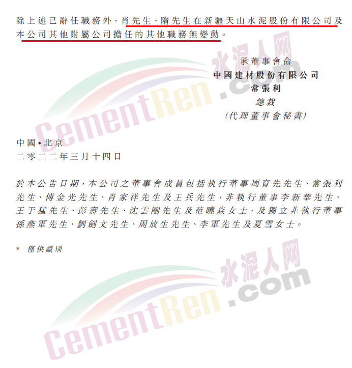 中國建材公告,肖家祥因工作變動(dòng)已辭任公司副總裁,自2022年3月14日起生效。肖將繼續(xù)留任公司執(zhí)行董事,為公司長遠(yuǎn)發(fā)展繼續(xù)提供支持。董事會亦宣布,隋玉民因工作變動(dòng)已辭任公司副總裁,自2022年3月14日起生效。