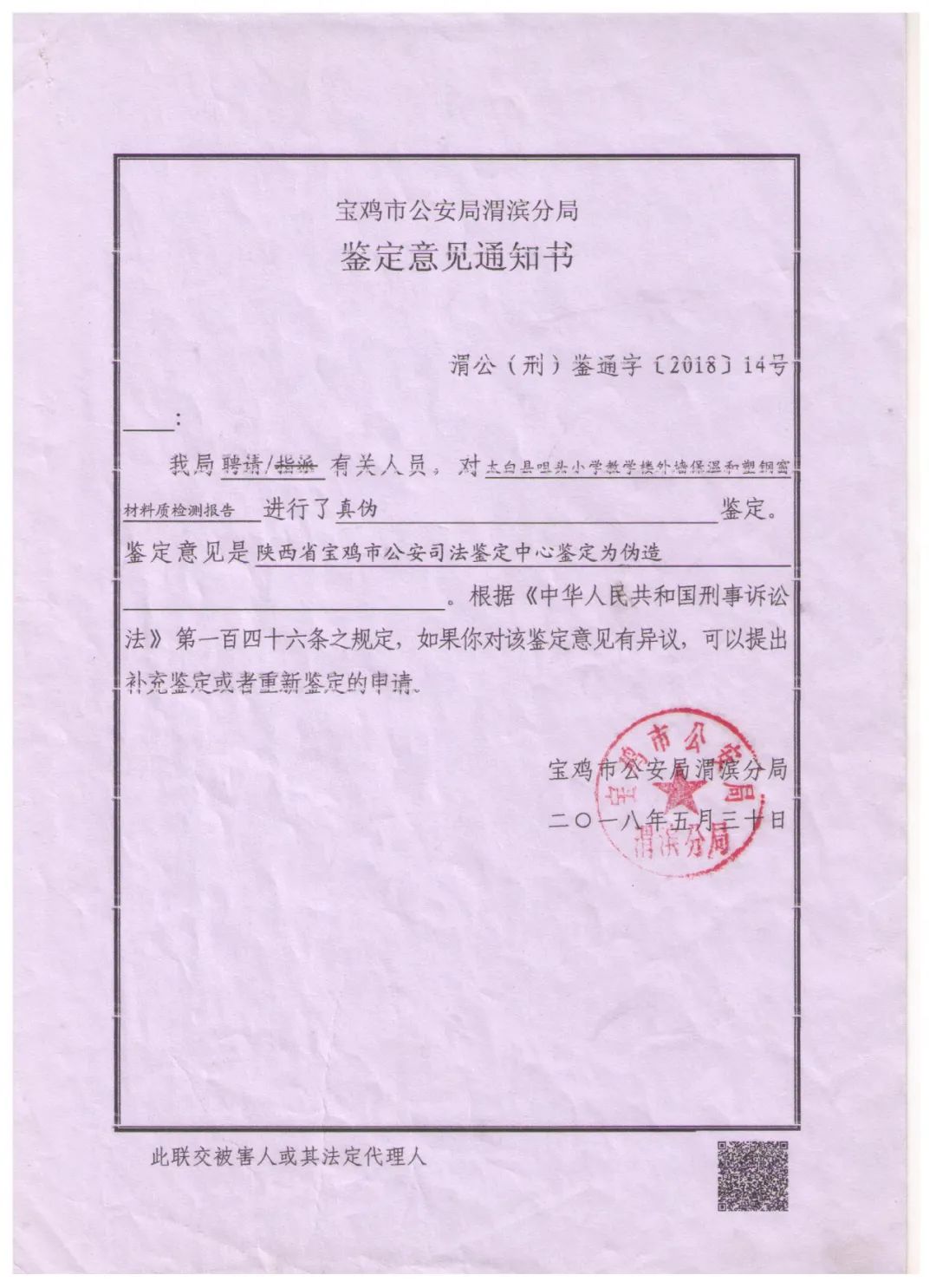 根據(jù)2018年5月寶雞市公安局渭濱分局出具的鑒定意見通知書,公安機(jī)關(guān)聘請有關(guān)人員對太白縣咀頭小學(xué)教學(xué)樓外墻保溫和塑鋼窗材料質(zhì)檢測報(bào)告進(jìn)行了真?zhèn)舞b定,陜西省寶雞市公安司法鑒定中心鑒定為偽造。