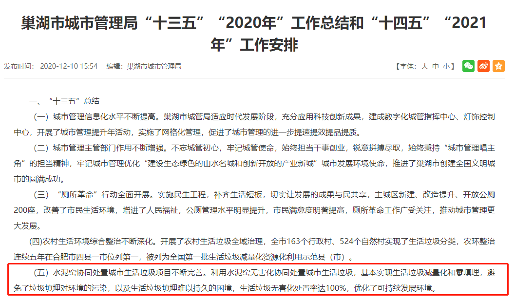這一點在巢湖市城市管理局“十三五”2020年工作總結(jié)中得到了印證:“水泥窯協(xié)同處置城市生活垃圾項目不斷完善。利用水泥窯無害化協(xié)同處置城市生活垃圾,基本實現(xiàn)生活垃圾減量化和零填埋,避免了垃圾填埋對環(huán)境的污染,以及生活垃圾填埋難以持久的困境,生活垃圾無害化處置率達(dá)100%,優(yōu)化了可持續(xù)發(fā)展環(huán)境。”在第五屆全國文明城市創(chuàng)建評比中,巢湖市脫穎而出。中材安徽在文明創(chuàng)城的進(jìn)程中功不可沒。