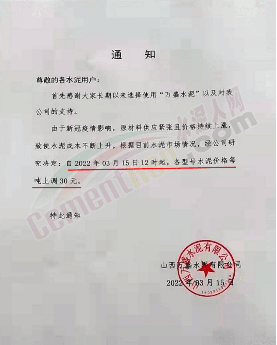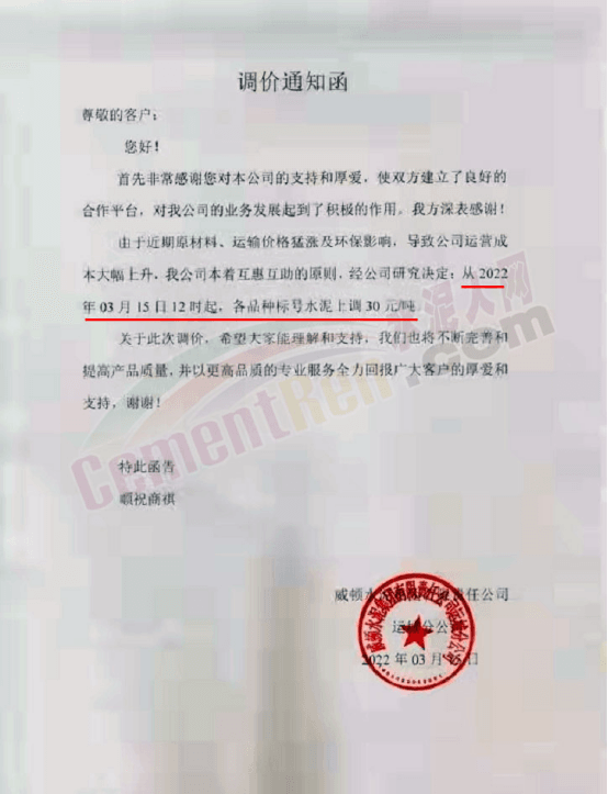 企業(yè)調(diào)價通知中提到,由于新冠疫情影響,原材料供應(yīng)緊張且價格持續(xù)上漲,疊加運費價格猛漲致使水泥成本不斷上升。