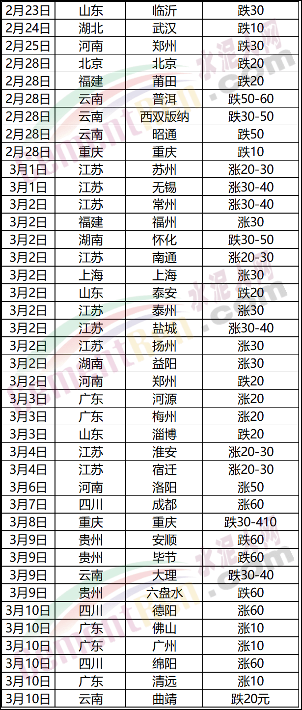 云南省曲靖漲30-50跌20元/噸,西雙版納漲50元/噸,跌30-50元/噸。