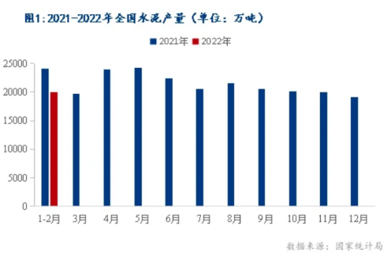 2022年1-2月,全國水泥產(chǎn)量同比大幅下降,創(chuàng)2011年以來同期次低水平,再次跌破2億噸。最新統(tǒng)計數(shù)據(jù)顯示,2022年1-2月,全國累計水泥產(chǎn)量1.99億噸,同比下降17.8%,去年同期為增長61.1%,產(chǎn)量絕對值低于去年同期4196萬噸。