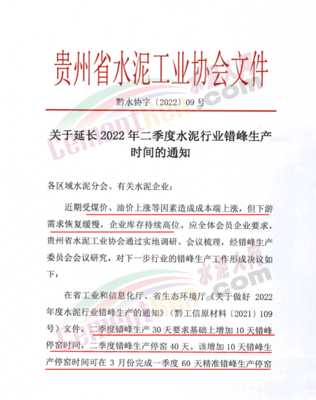 3月16日,貴州省水泥工業(yè)協(xié)會發(fā)布了《關(guān)于延長2022年二季度水泥行業(yè)錯峰生產(chǎn)時間的通知》稱,近期受煤價、油價上漲等因素造成成本端上漲,但下游需求恢復(fù)緩慢,企業(yè)庫存持續(xù)高位。應(yīng)企業(yè)要求延長2022年錯峰生產(chǎn)時間,其中二季度錯峰生產(chǎn)30天要求基礎(chǔ)上增加10天錯峰停窯時間,二季度錯峰生產(chǎn)停窯 40天。